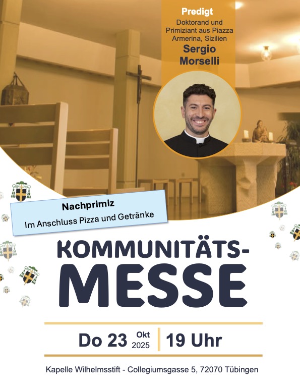 Der Primiziant und Doktorand Sergio Morselli wird seine Nachprimiz in der Kapelle des Wilhelmsstifts feiern, im Anschluss laden wir zu einer kleinen Glückwunschfeier bei Getränken und Pizza ein.
