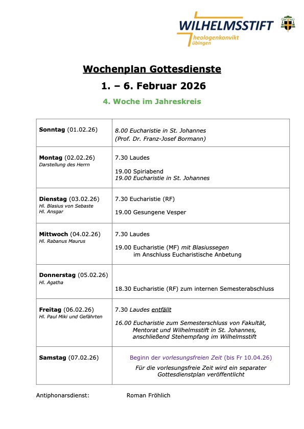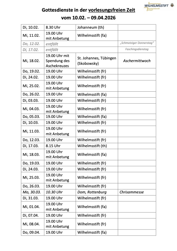 Herzliche Einladung zum Semesterabschlussgottesdienst von Wilhelmsstift, Mentorat und Fakultät, am Fr, 6. Februar 2026.