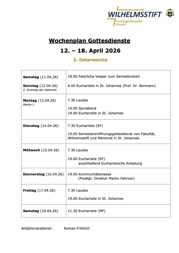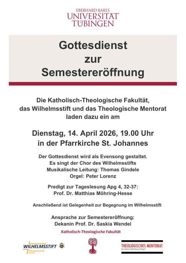 Herzliche Einladung zum Semestereröffnungsgottesdienst von Wilhelmsstift, Mentorat und Fakultät, am Di, 14. April 2026.